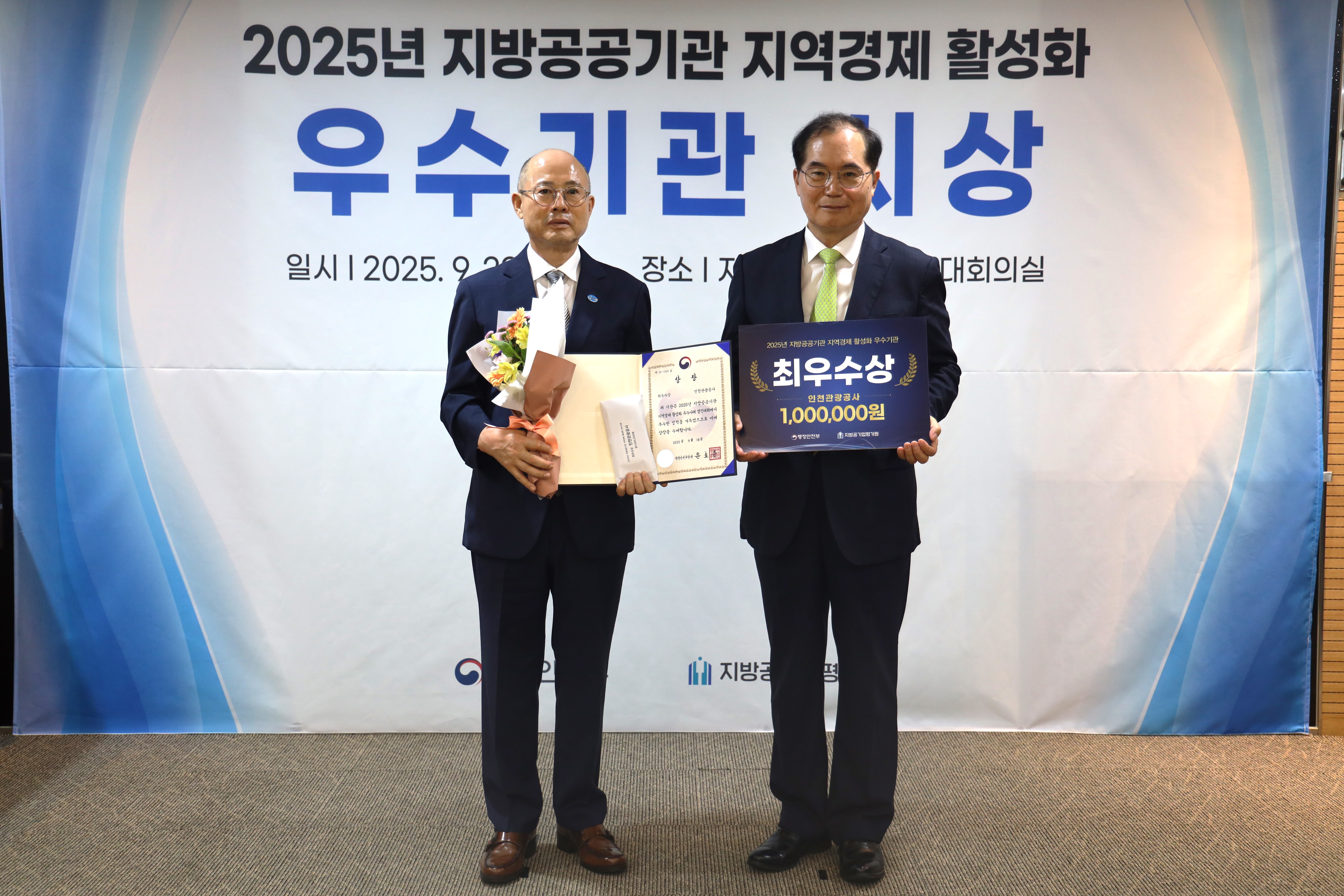 ○ 인천관광공사(사장 백현, 이하 ‘공사’)는 행정안전부와 지방공기업평가원이 공동 주최한 ‘2025년 지방공공기관 지역경제 활성화 우수사례’ 공모에서 ‘지역소비 촉진 및 지역상생·협력’ 분야 최우수 기관으로 선정되어 행정안전부 장관상(최우수상)을 수상했다고 밝혔다.